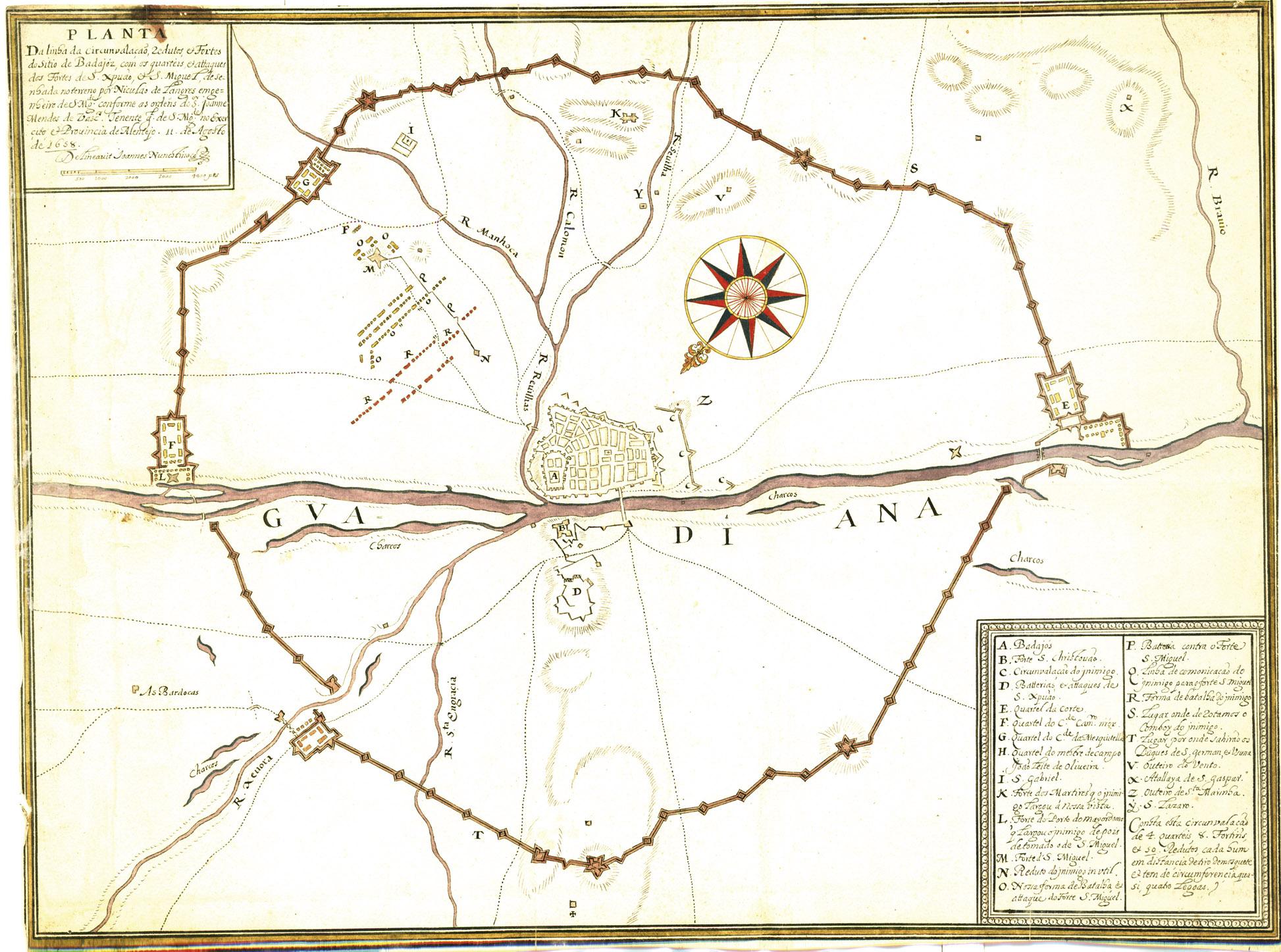 English: Map of the siege of Badajoz, 1658, by Joao Nunes Tinoco Español: Mapa del asedio de Badajoz de 1658, por Joao Nunes Tinoco