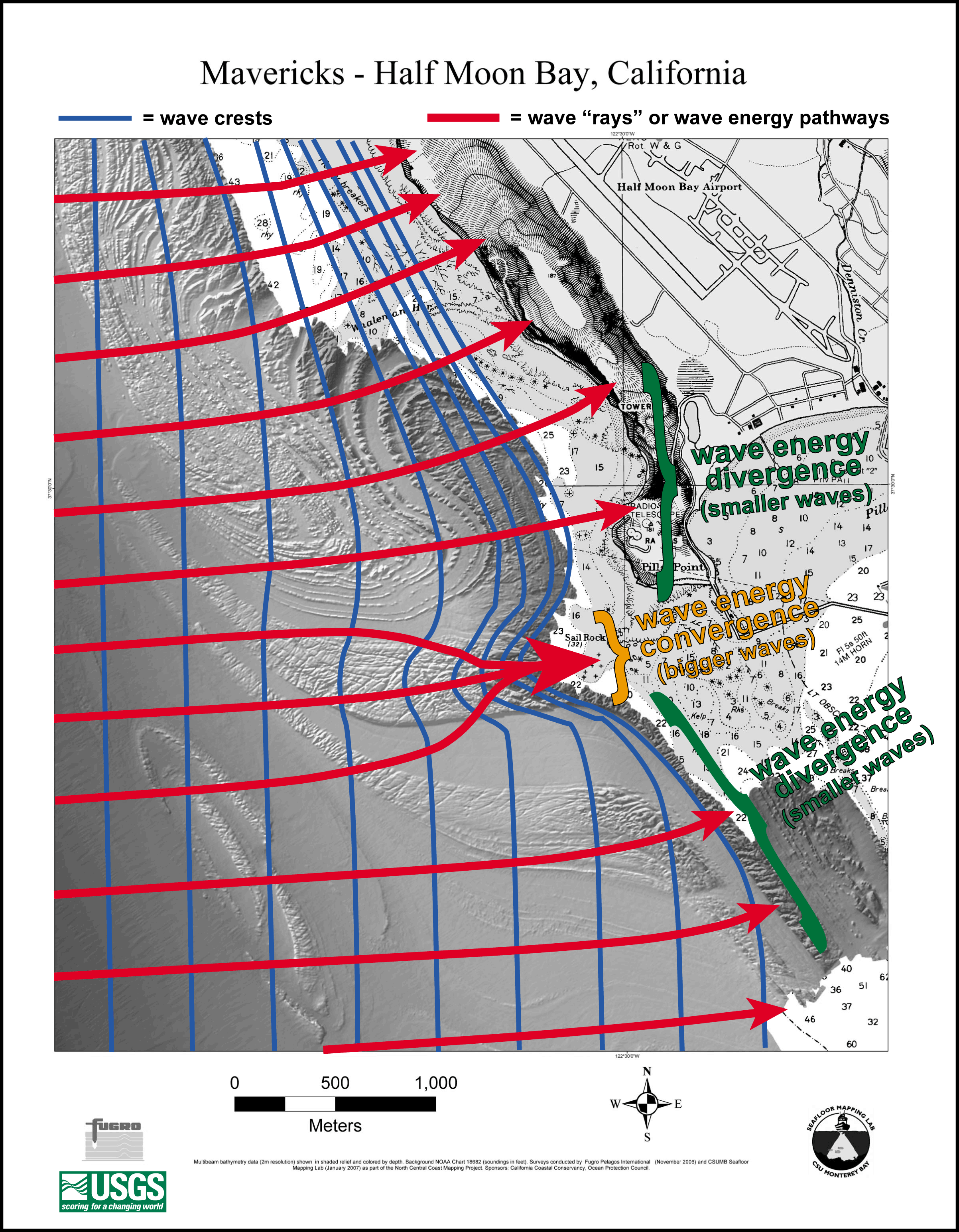 English: Diagram showing the effect of the bathymetry near the Mavericks surf break on the waves there.
