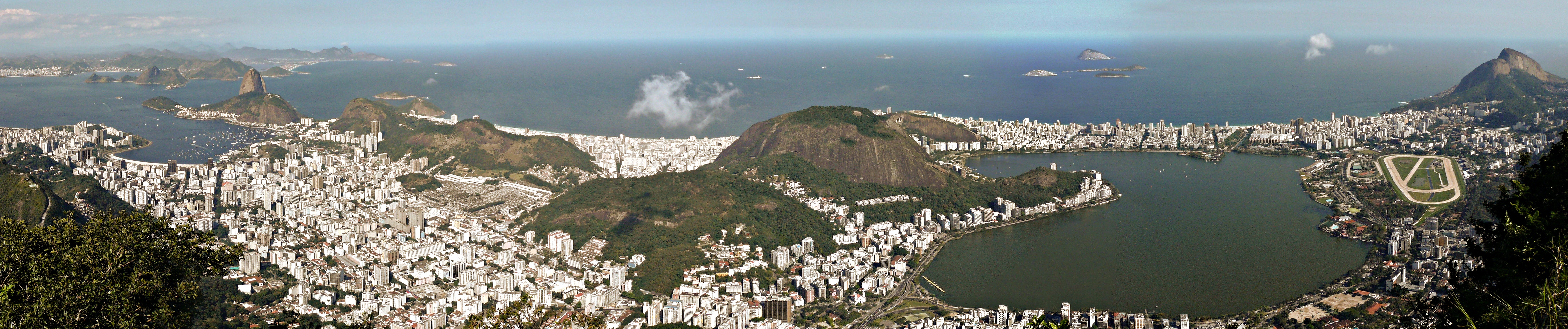 ASCII 8 images, Size: 9023 x 2447, FOV: 162.87? x 44.18?, RMS: 6.00, Lens: Standard, Projection: Spherical, Color: LDR Deutsch: Blick vom Corcovado über das südliche Rio de Janeiro: Links der Zuckerhut, Bildmitte: Copacaba zwischen zwei Hügeln, rechts: Ipanema zwischen See und Meer