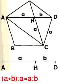 العلاقة بين القُطر والضلع للخماسي المنتظم هي نسبة ذهبية. |