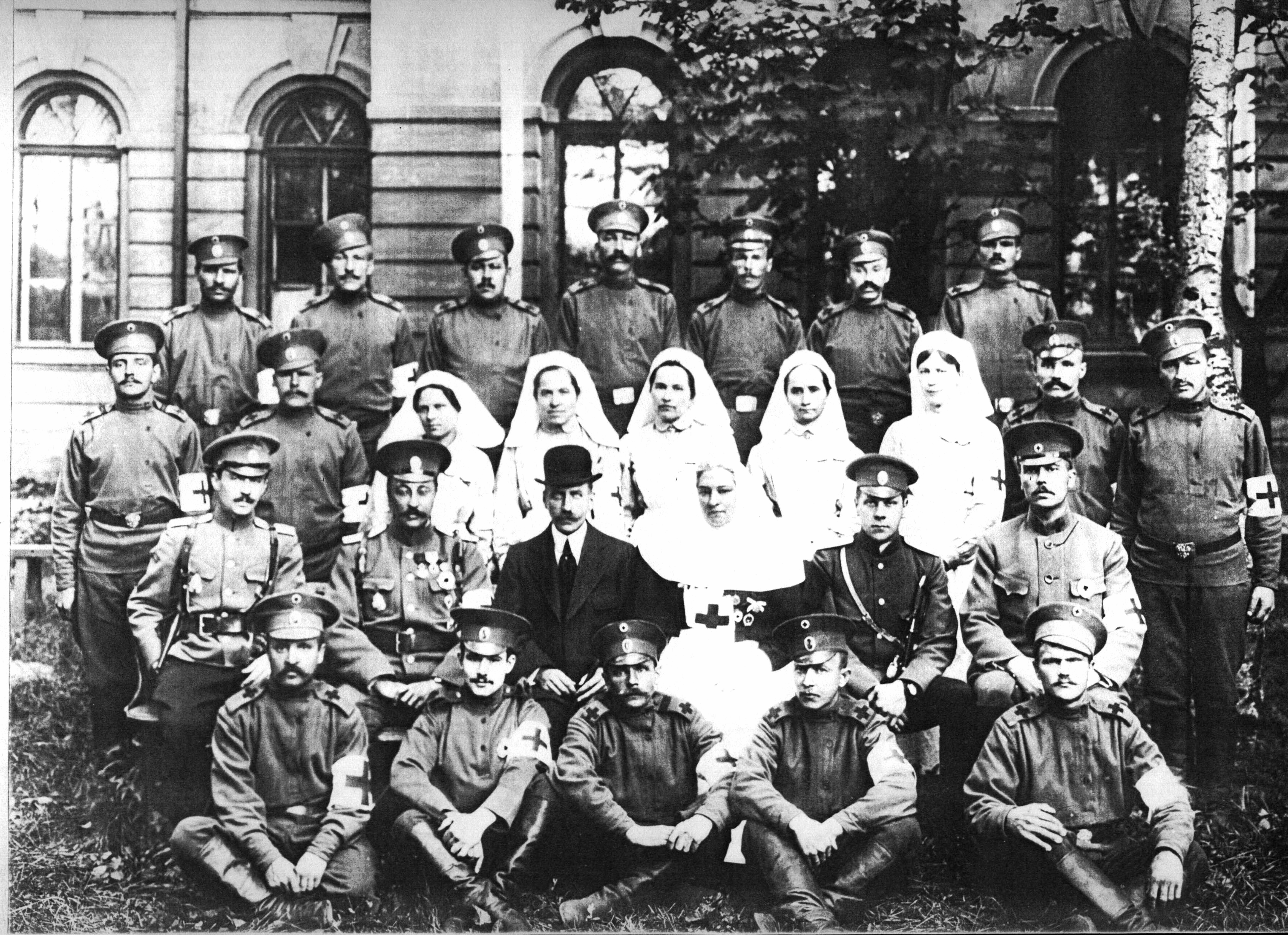 English: Photograph of some members of the field ambulance organized by Dr Cresson to help the Russian soldiers on the german theatre.
