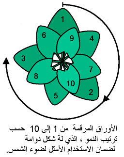 الأوراق من 1 إلى 10 المرقمة حسب ترتيب النمو ، الذي له ترتيب على شكل دوامة لضمان الاستخدام الأمثل لضوء الشمس. |
