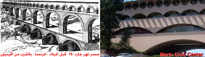 جسر نهر جارد 19- قبل الميلاد - فرنسا ، بالقرب من افينيون و "مركز مدنية مارين (Marin County Civic Center) استخدمت ال[دُويرية] بأربعة مقاييس مختلفة الحجم |