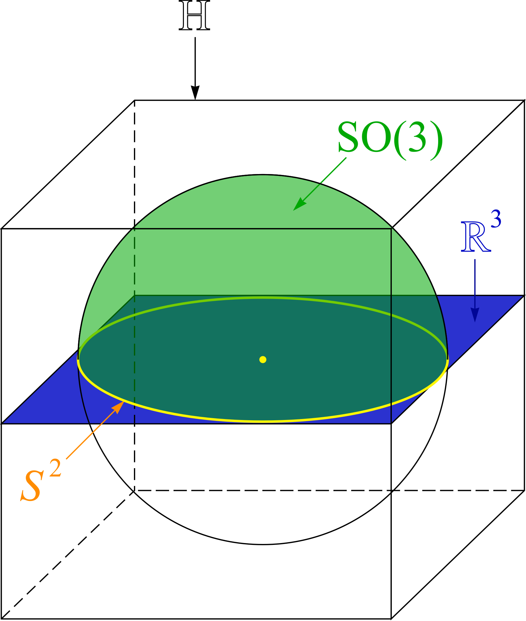 English: H (space of quaternions), SO(3) (3d special orthogonal group), R3 (3d real space), S2 (2d sperical surface, boundary of 3d sphere). |