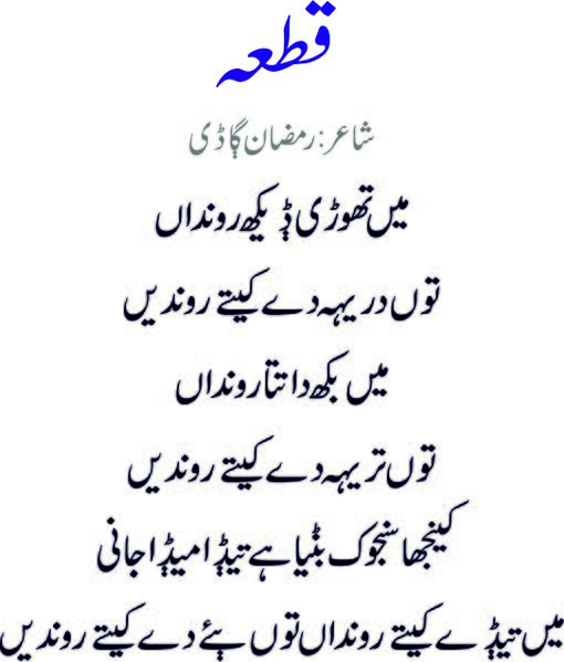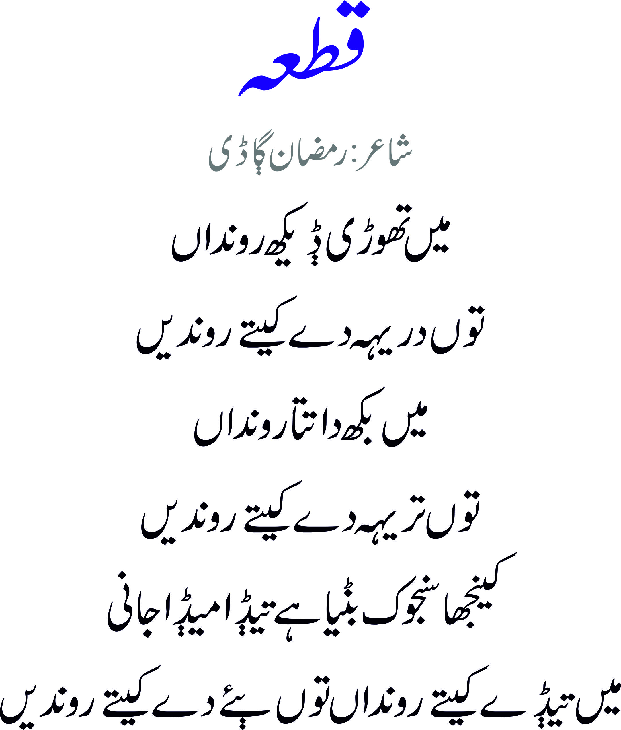 English: رمضان ڳاڈی سرائیکی شاعر ہن ۔ اناں دا تعلق پیر عادل ڈیرہ غازی خان نال تعلق ھے۔ محترم دی پیدائش اناں دے مطابق 1922 ہے۔ اناں دی شاعری انسان دے نازک جذبات دی عکاس ہے اور سرائیکی زبان دے خوب استعمال نال اپݨا پیغام پہچیندن۔