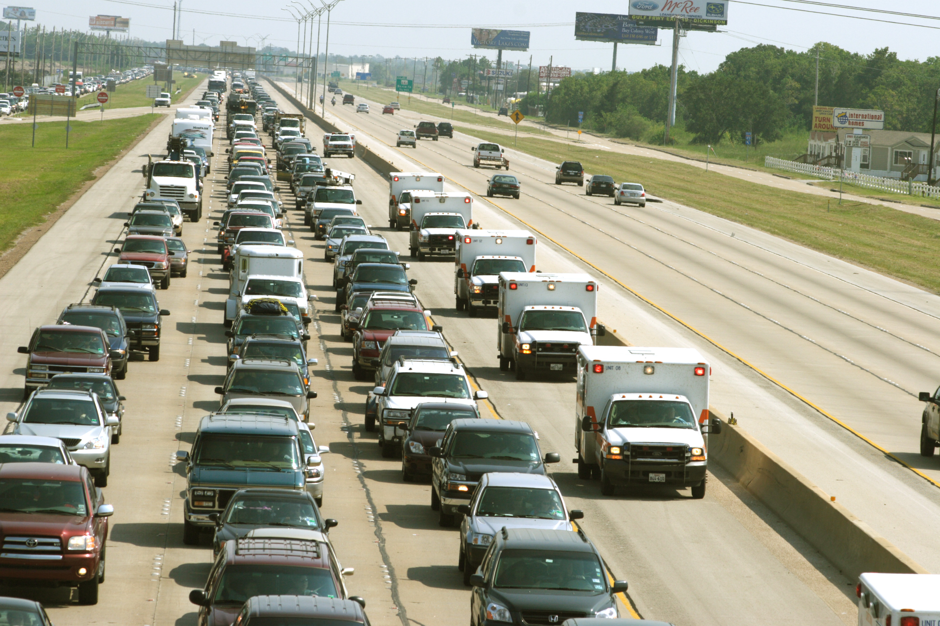 English: Houston, TX, September 21, 2005 -- Traffic on I 45 was mostly out of town, to the north, as Galveston citizens evacuated the coastal flood plains. The recent landfall of Hurricane Katrina near New Orleans had people hurrying to prepare for Hurricane Rita. This picture was taken from the Calder Road overpass in League City, looking towards the southeast. The northbound traffic is from Galveston heading towards Houston and beyond. |