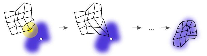 English: An illustration of the training of a Self-organising map. The blue blob is the distribution of the training data, and the small white disc is the current training sample drawn from that distribution. At first (left) the SOM nodes are arbitrarily positioned in the data space. The node nearest to the training node (highlighted in yellow) is selected, and is moved towards the training datum, as (to a lesser extent) are its neighbours on the grid. After many iterations the grid tends to approximate the data distribution (right).