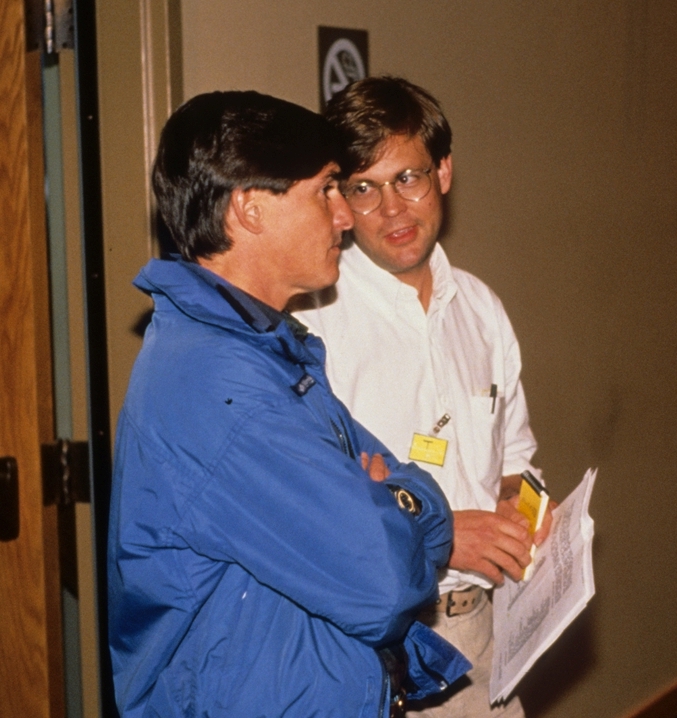 English: Alaska lieutenant governor Steve McAlpine listens to Ernie Piper, special assistant to Alaska governor Steve Cowper, during a meeting or press conference during the Exxon Valdez Oil Spill cleanup |