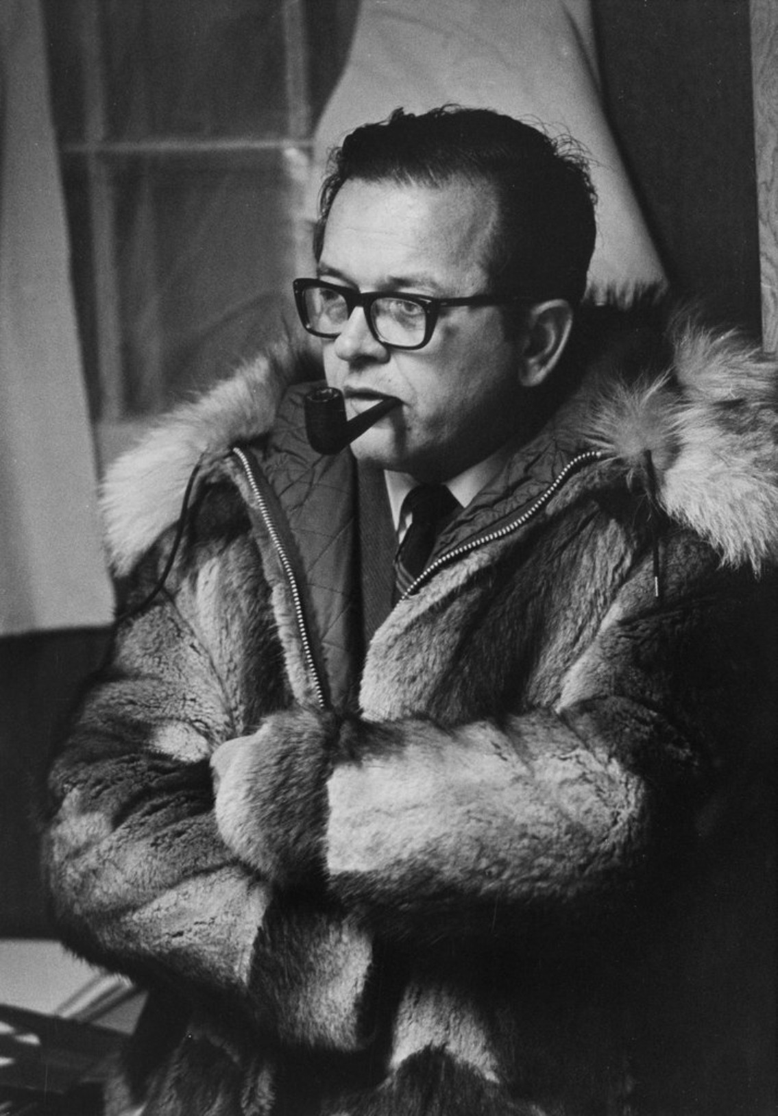 Ted Stevens in a fur coat, smoking a pipe, in 1970. |