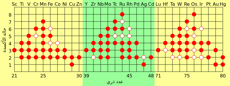 العربية: يوضح هذا الجدول بعض حالات التأكسد في مركبات عناصر الفلزات الانتقالية.
