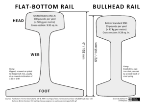 كانت أقدم السكك المستخدمة بشكل عام هي ما يسمى سكك الحديد ذات الحواف السمكية من حيث شكلها. كانت السكك الحديدية المصنوعة من الحديد الزهر هشة وتكسر بسهولة. لم يكن بإمكانها سوى أن تُصنع بأطوال قصيرة سرعان ما تصبح غير متساوية. حصل جون بيركنشو على براءة اختراع في عام 1820,[5] مع تحسين تقنيات الدرفلة، تم إدخال الحديد المطاوع بأطوال أطول، ليحل محل الحديد الزهر ويساهم بشكل كبير في النمو الهائل للسكك الحديدية في الفترة من 1825 إلى 1840. كان المقطع العرضي يختلف على نطاق واسع من خط إلى آخر، ولكنها كانت من ثلاثة أنواع أساسية كما هو موضح في الرسم البياني. كان المقطع العرضي المتوازي الذي تطور في السنوات اللاحقة يُشار إليه بـ رأس الثور.