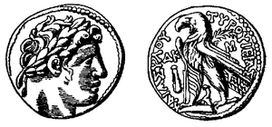 Gregory Nazianzen (Oratio 4.108) and Cassiodorus (Variae 1.2) relate how Tyrian Heracles and the nymph Tyrus were walking along the beach when Heracles' dog, who was accompanying them, devoured a murex snail and gained a beautiful purple color around its mouth. Tyrus told Heracles she would never accept him as her lover until he gave her a robe of that same colour. So Heracles gathered many murex shells, extracted the dye from them, and dyed the first garment of the colour later called Tyrian purple. The murex shell appears on the very earliest Tyrian coins and then reappears again on coins in Imperial Roman times.
