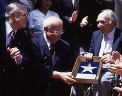 Johnny Grant, center, at producer Joe Pasternak's presentation ceremony in 1991. At left is Gene Kelly.