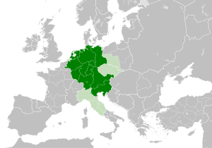 مملكة ألمانيا أو المملكة الألمانية (لاتينية: Regnum Teutonicum, "Teutonic Kingdom"؛ ألمانية: Deutsches Reich) developed out of the eastern half of the former Carolingian Empire. Like Anglo-Saxon England and medieval France, it began as "a conglomerate, an assemblage of a number of once separate and independent... gentes [peoples] and regna [kingdoms]."[1] East Francia (Ostfrankenreich) was formed by the Treaty of Verdun in 843, and was ruled by the Carolingian dynasty until 911, after which the kingship was elective. The initial electors were the rulers of the stem duchies, who generally chose one of their own. After 962, when Otto I was crowned emperor, the kingdom formed the bulk of the Holy Roman Empire, which also included Italy (after 951), Bohemia (after 1004) and Burgundy (after 1032).