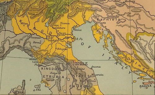 وفي هذه الأثناء واصل نابليون جهوده لصبغ إيطاليا بالصبغة النابليونية، ففي سبتمبر 2081 ألحق بيدمونت بفرنسا، وفي يونيو سنة 5081 حث حكومة جنوة على طلب إدماج الجمهورية الليجورية في الإمبراطورية الفرنسية• وفي سبتمبر 5081 ضم دوقيات بارما Parma وبياسنزا Piacenza وجواستالا Guastalla• وفي ديسمبر 5081 - بعد محق الجيش النمساوي في معركة أوسترليتز - حث الإمبراطور فرانسيس الثاني على تسليم فينيزيا (فينيتسيا Venezia) لمملكة يوجين الجديدة• وكانت البندقية Venice شديدة الامتنان لهذا التعويض الجزئي عن المقايضة غير العادلة التي عقدها نابليون مع البنادقة في سنة 7971، وعبرت عن امتنانها هذا بإقامة مهرجانات الترحيب به(بنابليون) عندما زار مدينتهم في سنة 7081(7)• وفي مايوسنة 8081 تولى أمر دوقية تسكانيا Tuscany الكبيرة في وقت كانت الإدارة النمساوية بها في أحسن حالاتها• وحكمت ليزا أخته (أخت نابليون) لوسا Lucca حكما طيبا حتى إن نابليون حولها إلى تسكانيا وبفضل حكمتها وسياسة الاسترضاء التي اتبعتها أصبحت فلورنسا ملاذا للآداب والفنون يعيد إلى الأذهان ذكرايات أيام آل ميدتشي•