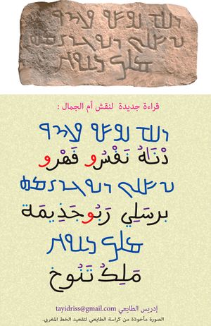 - ^ 1- نص شاهد القبر: "1- هذا قبر امرئ القيس بن عمرو ملك العرب كلهم الذي تقلد التاج. 2- واخضع قبيلتي أسد ونزار وملوكهم وهزم مذحج وقاد. 3- الظفر إلى أسوار نجران مدينة شمر واخضع معدا واستعمل بنيه. 4- على القبائل ووكلهم فرساناً فلم يبلغ ملك مبلغه. 5- إلى اليوم. توفى سنة 223 م في 7 من أيلول وفق بنوه للسعادة", عام 223 بتقويم بصرى يوافق 328 ميلادي, المصدر جواد علي ج3, ص101.