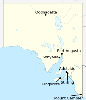 Labelled map of South Australia showing where the places mentioned in the table are located