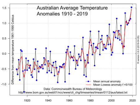 يعد التغير المناخي في أستراليا قضية سياسية مثيرة للجدل إلى حد كبير.[1][2] ارتفعت درجات الحرارة في البلاد بنحو 0.7 درجة مئوية بين عامي 1910 و 2004، عقب الاتجاه المتزايد للاحتباس الحراري.[3] ارتفعت درجات الحرارة الدنيا بين عشية وضحاها بشكل أسرع من درجات الحرارة القصوى خلال النهار في السنوات الأخيرة. يُعزى الاحترار في أواخر القرن العشرين إلى حد كبير إلى زيادة تأثير الاحتباس الحراري.[4] وحسب مكتب الأرصاد الجوية (BOM)، 80% من الأرض تتلقى أقل من 600 mm (24 in) من الأمطار سنوياً، بل ويتلقى 50% أقل من 300 mm (12 in).[5] ككل ، متوسط هطول الأمطار السنوي في أستراليا منخفض جداً قدره 419 mm (16 in).[6]