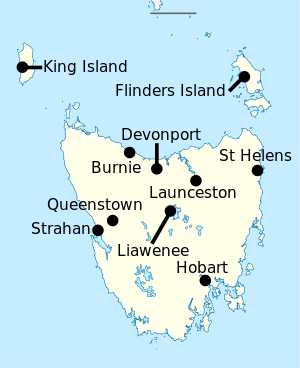 Map of Tasmania with the locations shown in the table labelled