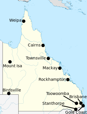 Labelled map of Queensland showing where the places mentioned in the table are located