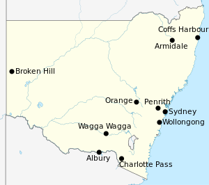 Labelled map of New South Wales showing where the places mentioned in the table are located