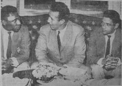 الرئيس الجزائري السابق أحمد بن بلة يتحدثث مع أسطورتي كرة القدم البرازيلية بيليه وغارينشا في مدينة وهران