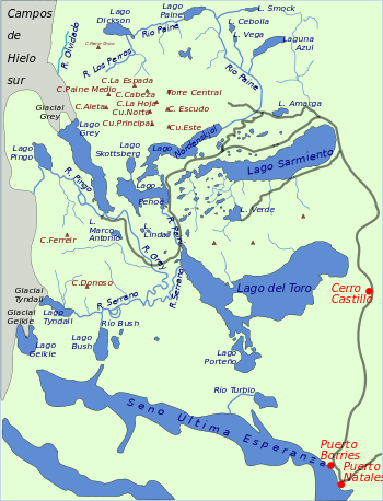 31. ^ أ ب García, Juan-Luis; Hall, Brenda L.; Kaplan, Michael R.; Vega, Rodrigo M.; Strelin, Jorge A. (2014). "Glacial geomorphology of the Torres del Paine region (southern Patagonia): Implications for glaciation, deglaciation and paleolake history". Geomorphology. 204: 599–616. Bibcode:2014Geomo.204..599G. doi:10.1016/j.geomorph.2013.08.036. hdl:10533/129777.