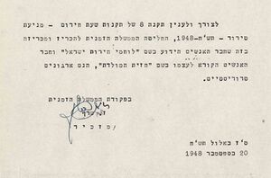 98. ^ "For the purposes of Regulation 8 of the Emergency Regulations – Prevention of Terrorism – 5748–1948, the Provisional Government has decided to declare that the group of people known as 'Freedom Fighters of Israel' and the members of the so-called 'Homeland Front' are terrorist organizations. By order of the provisional administration. Ze'ev Sharaf (Government Secretary)."
