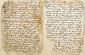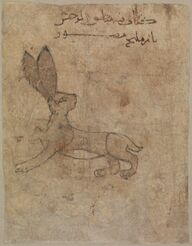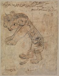It is rare to have an example of both text and illustrations of the same page, which makes it difficult to gather information about illuminated manuscripts. In some cases, it is possible that illustrations were added to an already existing text at a later date.[48] Fatimid illustration style can be demonstrated by one surviving piece of paper, which was excavated in Cairo. This single sheet of paper has drawings on both sides; one side showing a lion, and the other, a hare. While it is unclear whether this page originated from a work of, potentially, scientific or zoological subject matter, it is an example of larger patterns of naturalistic and figural representation within Fatimid art.[50]
