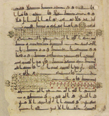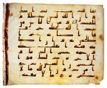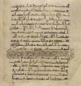 Written in the territory of modern Iraq in the Kufic script. Now kept in the Hast Imam library, in Tashkent, Uzbekistan.[42][43] Its verse endings are marked by small panels of diagonals lines; the tenth verse is marked with a square medallion illuminated in blue, green, red and manganese with a stellar design.[44]
