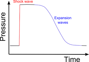 - تتكون الموجات الصدمية بتفاعل ما بين جسمين غازيين مختلفين بالضغط، حيث تتمدد موجة الصدمة داخل الغاز الأقل كثافة وموجة التمدد تنتشر داخل الغاز الأعلى ضغط.