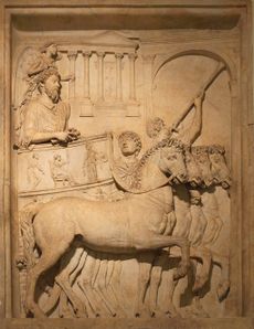 Tuba player (upper right) in a relief depicting Marcus Aurelius in triumph