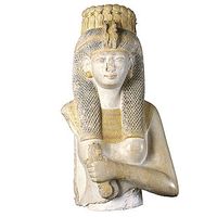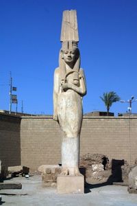 ويتميز هذا التمثال بما يشيع فيه من حلاوة الصبا ورقة الابتسامة وزهاء الألوان بما جعله من أجمل ما صدر عن عصر الرعامسة ،إذ يري الشعر المستعار معقوصاً في ثلاث غدائر متدرجة الخصل أزرق الصبغة يمسكه رباط مزدوج يتدلي منه ثعبانين مكللان بتاجي الوجه البحري والقبلي .