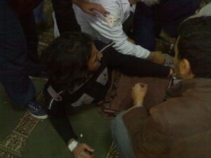 مينا دانيال في المستشفى الميداني بمسجد عباد الرحمن بالتحرير يوم 30 يناير 2011 أثناء علاجه من إصابة لحقت به أثناء جمعة الغضب
