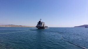 سفينة راسية في ميناء قنا بمحافظة شبوة.
