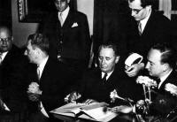 Consistent in his view that "in exerting political pressure at home, one must always be cautious and tactful or risk incurring the hostility of influential diplomatic figures,"[22] neither Goldmann nor the Jewish leadership around him mounted a public campaign against the American immigration quota system even as European Jewry were seeking refuge from Nazism. Some American Jews, including Louis Brandeis and Felix Frankfurter, did try their hands at quiet diplomacy with some success, such that the quotas were being filled by 1939. The worsening of the refugee problem after the Anschluss in 1938, however, created additional pressure, leading President Roosevelt to call for an international conference known as the Evian Conference, which met in France in July of that year. The conference goal was to find homes for the hundreds of thousands of displaced Jews. Goldmann attended as an observer for the World Jewish Congress.[23] Of the 32 nations that attended, only the Dominican Republic agreed to accept additional refugees.[24]