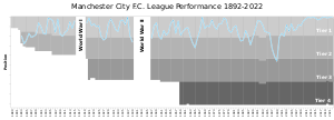 شارك مانشستر سيتي في الدوري الإنگليزي الممتاز عام 1892، وفاز بأول لقب له ببطولة كأس الاتحاد الإنگليزي عام 1904. وحقق النادي أول فترة كبيرة من النجاح في أواخر الستينيات وأوائل السبعينيات، حيث فاز بالدوري، وكأس الكؤوس الأوروپية، كأس الاتحاد الإنگليزي وكأس الرابطة تحت إدارة جو مرسر ومالكوم أليسون. بعد خسارة نهائي كأس الاتحاد الإنگليزي لعام 1981، مر النادي بفترة من التراجع بلغت ذروتها في الهبوط إلى دوري الدرجة الثالثة للمرة الوحيدة في تاريخه. عاد النادي وصعد إلى الدرجة الأولى في 2001-2002 وظلوا مشاركاً دائماً بالدوري الممتاز منذ 2002-2003.