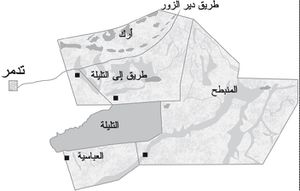 واسعة الانتشار بين دير الزور والسخنة في السهول الطموية الجصية التربة القليلة الملوحة؛ بتغطية 20% مع القبا السنائية والكاريكس والسالفيا الفلسطينية والأونوبريكس بناتا والاكيليا كونفيرتا (العبيثران) والأسفوديلوس ضامر الورق (بّرْوَق) وغيرها.