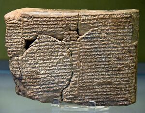 جزء مما يسمى شاهد "برج بابل"، والذي يصور نبوخذ نصر الثاني على اليمين ويتميز بتصوير زقورة بابل العظيمة (إيتمنانكي) إلى يساره[أ]
