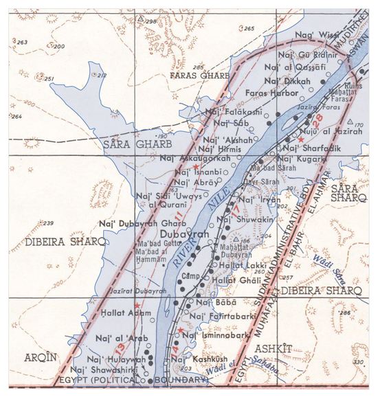 وبعد رسم خريطة مفصلة في 1953، قبل الغمر، فقد كان بوسع المرء عد 52 قرية في المنطقة، منهم 24 غرب النيل (17 بأسماء على الخريطة)، و 29 شرق النيل (12 بأسماء)، وقرية واحدة غير مسماة على جزيرة فرس في النهر. أكبر بلدة والوحيدة ذات التعداد الذي يفوق 2,000 نسمة كانت دبيرة.[1]