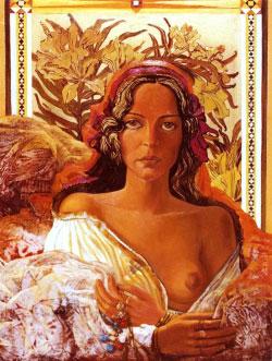 لوحاته في تلك الفترة كانت ذات جو ملحمي حالم يغلف الأماكن: وجوه سمراء، عناصر ومفردات من الأنتيكا والمصنوعات الحرفية المحلية والحاجات اليومية ليدهش بذلك الجمهور بمواضع أثيرة محببة لديه. لم تلبث هذه المواضيع أن تطورت لتصبح مناظر استشراقية تسكنها فتيات عاريات الصدر أو طبيعة صامتة مغرقة في الزخرفة. بورتريهات في ديكور شرقي دمشقي بامتياز وتفاصيل دقيقة لموتيفات نباتية تحتل مساحات لا بأس بها من اللوحة. “نباتات ووجه” (1974) و”تفتح الزنابق” (1974) وعازفة المزمار (1983) هي من اللوحات التي تمثل بامتياز هذه الفترة التي سماها “الواقعية السحرية”.