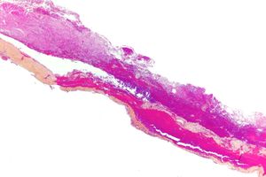 Micrograph of a chronic subdural hematoma, as demonstrated by thin strands of collagen and neovascularization. HPS stain.