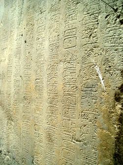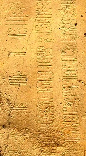 نصب لا موخرّا 1 La Mojarra Stela 1 هو نصب منحوت في وسط أمريكا يعود إلى سنة 156م[1] (القرن الثاني الميلادي). It was discovered in 1986, pulled from the Acula River near La Mojarra, ڤيراكروز، المكسيك، ليس بعيداً عن Tres Zapotes archaeological site. The 4+1⁄2-قدم-wide (1.4 m) by 6+1⁄2-قدم-high (2.0 m), four-ton limestone slab contains about 535 glyphs of the Isthmian script. أحد أقدم السجلات المكتوبة المعروفة من وسط أمريكا، هو هذا النصب من الثقافة حول الأولمية ليس فقط يسجل إنجازات هذا الحاكم، ولكن يضع تلك الإنجازات ضمن إطار cosmological من التقاويم والأحداث الفلكية.[2]