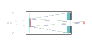 In sub-aperture corrector designs, the corrector elements are usually at the focus of a much larger objective. These elements can be both lenses and mirrors, but since multiple surfaces are involved, achieving good aberration correction in these systems can be very complex.[4] Examples of sub-aperture corrector catadioptric telescopes include the Argunov–Cassegrain telescope, the Klevtsov–Cassegrain telescope and sub-aperture corrector Maksutovs, which use as a "secondary mirror" an optical group consisting of lens elements and sometimes mirrors designed to correct aberration, as well as Jones-Bird Newtonian telescopes, which use a spherical primary mirror combined with a small corrector lens mounted near the focus.[11]