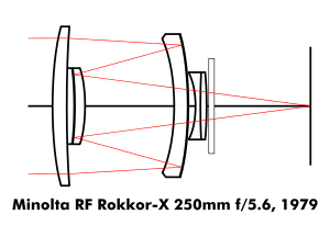 Example of a catadioptric lens using rear surfaced "mangin mirrors" (Minolta RF Rokkor-X 250mm f/5.6)