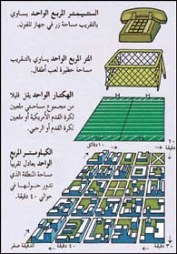 وتقاس الأراضي أحيانا بوحدات تعرف باسم الهكتارات، حيث يساوي الهكتار 10,000 متر مربع أو ما يعادل ½2 آكر (فدان إنجليزي) تقريبا. أما مساحات الأراضي الكبيرة كالمدن أو الأقطار، فتقاس بالكيلومترات المربعة. ويساوي الكيلومتر المربع حوالي 247 آكرًا أوحوالي 3/8 ميل مربع.
