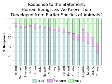 Most vocal literalist creationists are from the US, and strict creationist views are much less common in other developed countries. According to a study published in Science, a survey of the US, Turkey, Japan and Europe showed that public acceptance of evolution is most prevalent in Iceland, Denmark and Sweden at 80% of the population.[16] There seems to be no significant correlation between believing in evolution and understanding evolutionary science.[17][18]