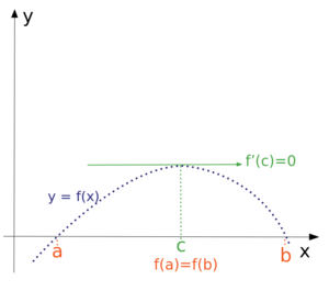 في الحسبان، Rolle's theorem essentially states that any real-valued differentiable function that attains equal values at two distinct points must have at least one stationary point somewhere between them—that is, a point where the first derivative (the slope of the tangent line to the graph of the function) is zero.