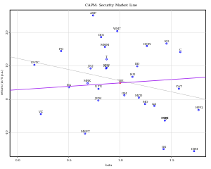 An estimation of the CAPM and the Security Market Line (purple) for the Dow Jones Industrial Average over 3 years for monthly data.