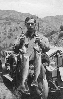 صياد مع صيده من steelhead في lower Sespe Creek، تصوير William A. Brown, winter, 1911